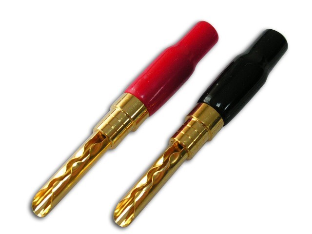 Kvalitní zlacený banánek s trubičkovým kontaktem. Pro 4 mm kabel.