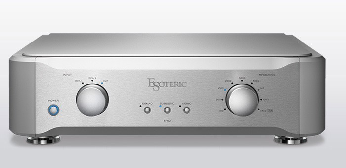 Esoteric E-02 je špičkový Phono předzesilovač s nekompromisní konstrukcí v plně symetrickém dual-mono provedení. Hlavní zesilovací část používá minimum zpětné vazby a přesnost RIAA křivky je +/-0,2 dB. Výstupní část využívá obvod HCLD, stejný jako je v referenčním předzesilovači Grandioso C1. Esoteric E-02 je vybaven výstupními obvody ES-LINK Analog, využívajícími proudový přenos signálu s nejnižším zkreslením. Maximální zisk předzesilovače přes XLR MC vstup je 72 dB.