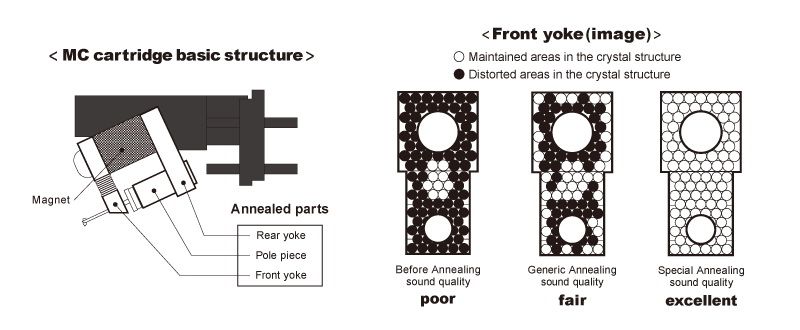 Japonský Dynavector začal u svých přenosek používat novou technologii pro vylepšení zvuku. Jedná se o magnetické žíhání (Magnetic Annealing), jehož cílem je zdokonalení magnetické permeability pomocí homogenizace krystalické struktury magnetického materiálu (viz obr.). Magnetické žíhání se provádí ohřevem a ochlazením a jelikož každý materiál vyžaduje jiný postup, Dynavector provedl podrobný výzkum. Jeho výsledkem byly optimalizované parametry celého procesu - teplota žíhání, prostředí žíhání, doba ohřevu, rychlost ohřevu a rychlost ochlazování. Výsledkem procedury je magnetický tok s velmi vysokou hustotou a stabilitou a následně dokonale čistý, dynamický zvuk s vynikajícím rozlišením a perfektním podáním prostoru.