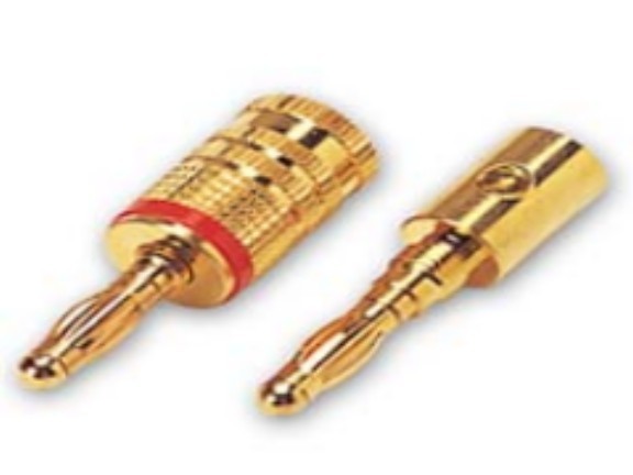 Kvalitní celokovový zlacený banánek s pérovými kontakty. Pro 4 - 6 mm kabel.